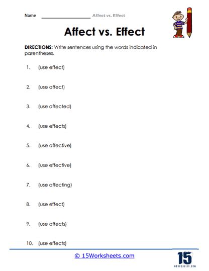 Web how to use this affect vs effect worksheet 1. Worksheets are affect effect work 1, affect or effect, affect effect work 1 answers, the language arts magazine name. Web this poster aims to help you to teach your student the definitions, examples and differences in using affect and effect.